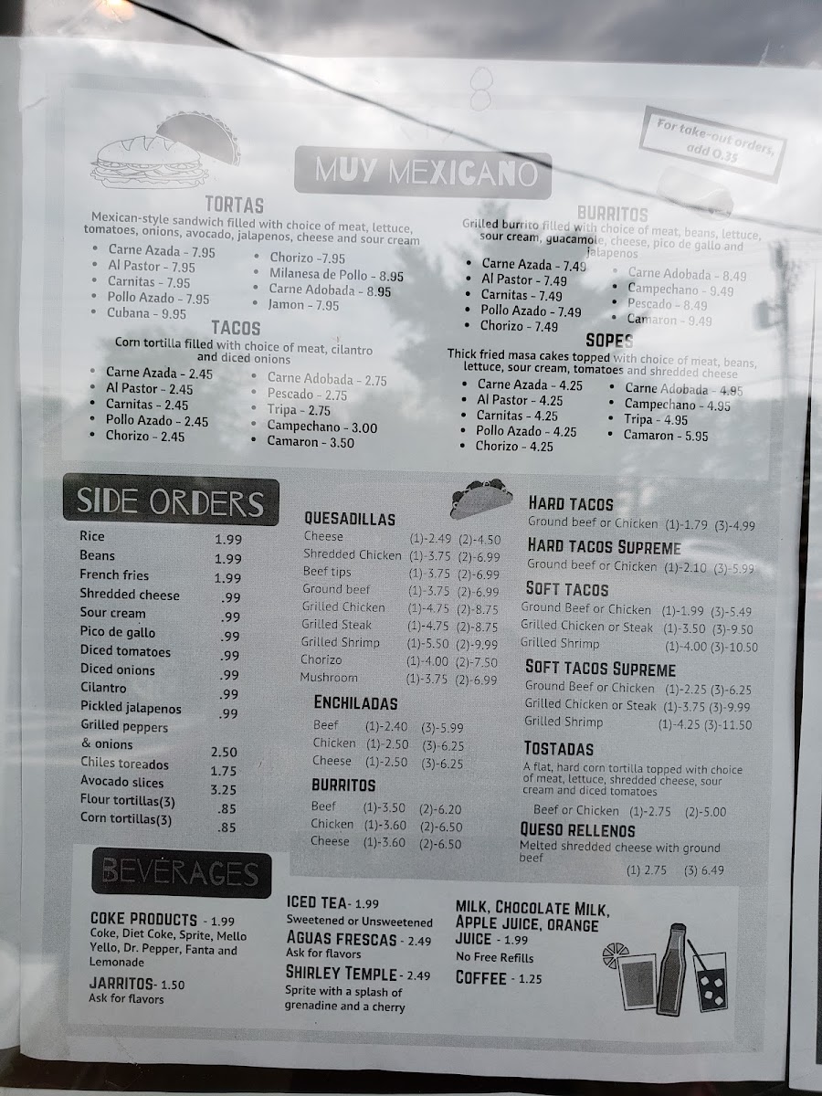 Whether you're stopping by for a quick bite or settling in for a full meal, the menu features everything from shareable appetizers like cheese dip and guacamole to main courses such as chicken fajitas and enchiladas. Freshly prepared items like shrimp tacos and fajitas al pastor pair well with refreshing beverages like their signature Coronarita or a traditional cantarito, creating an enjoyable dining experience that complements the cozy and friendly atmosphere.